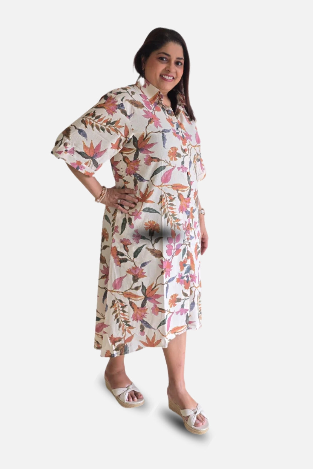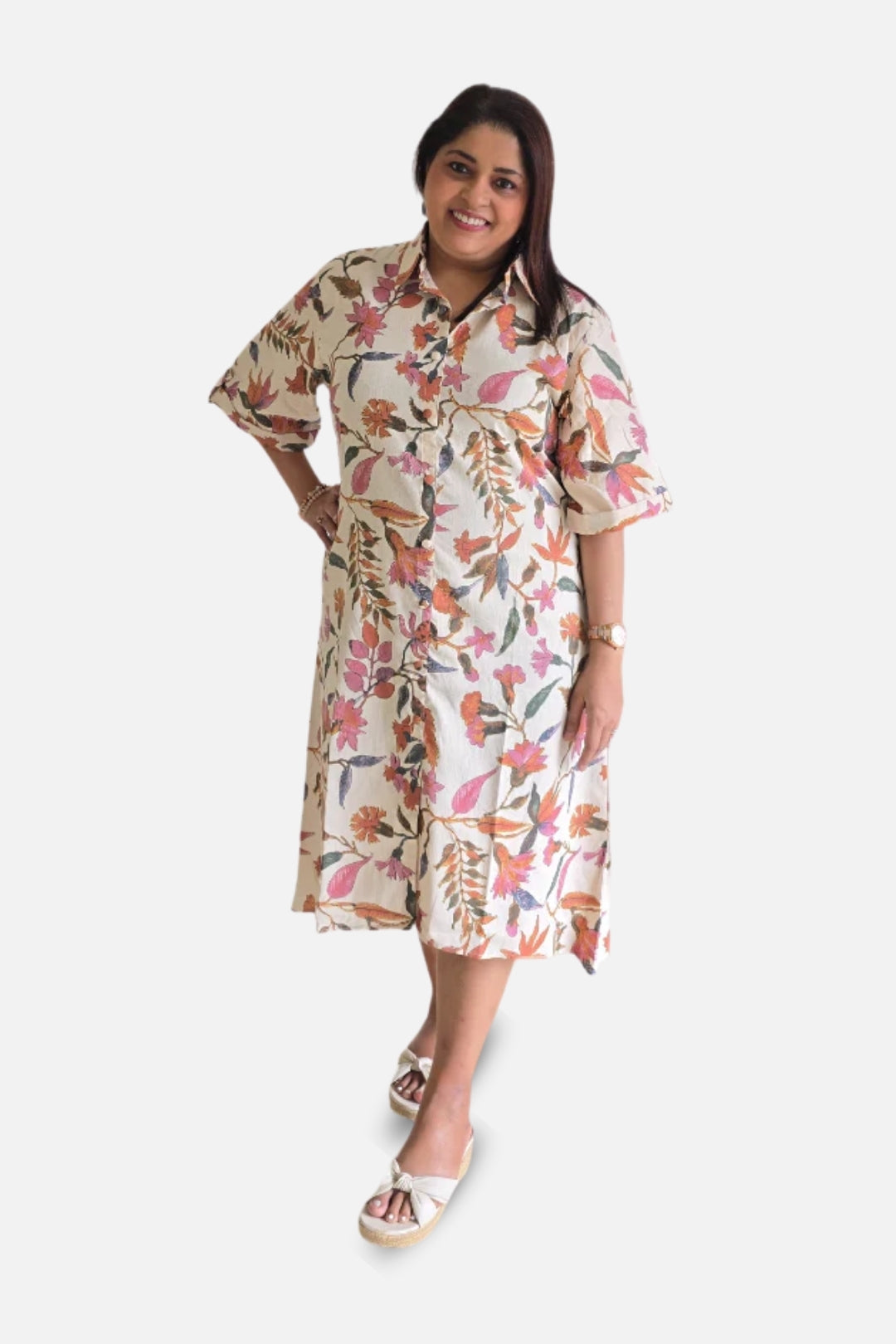 Embrace effortless elegance with our Cotton Beige Floral Shirt Dress. Crafted from soft, breathable cotton, this dress features a classic shirt silhouette elevated with delicate floral prints. The neutral beige base adds sophistication, while the floral details bring a touch of freshness and charm. Designed for comfort and versatility, it transitions seamlessly from casual daywear to an easy evening look. Style it with strappy sandals and a tote for daytime chic, or statement earrings and heels for an evening out.