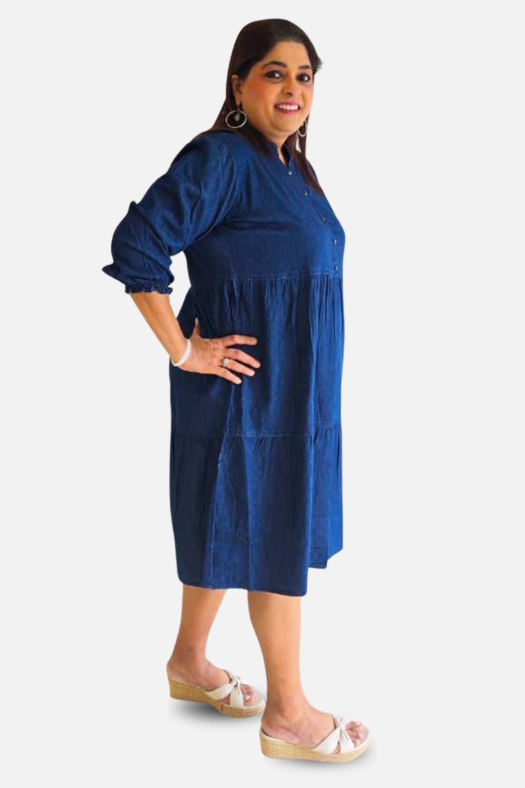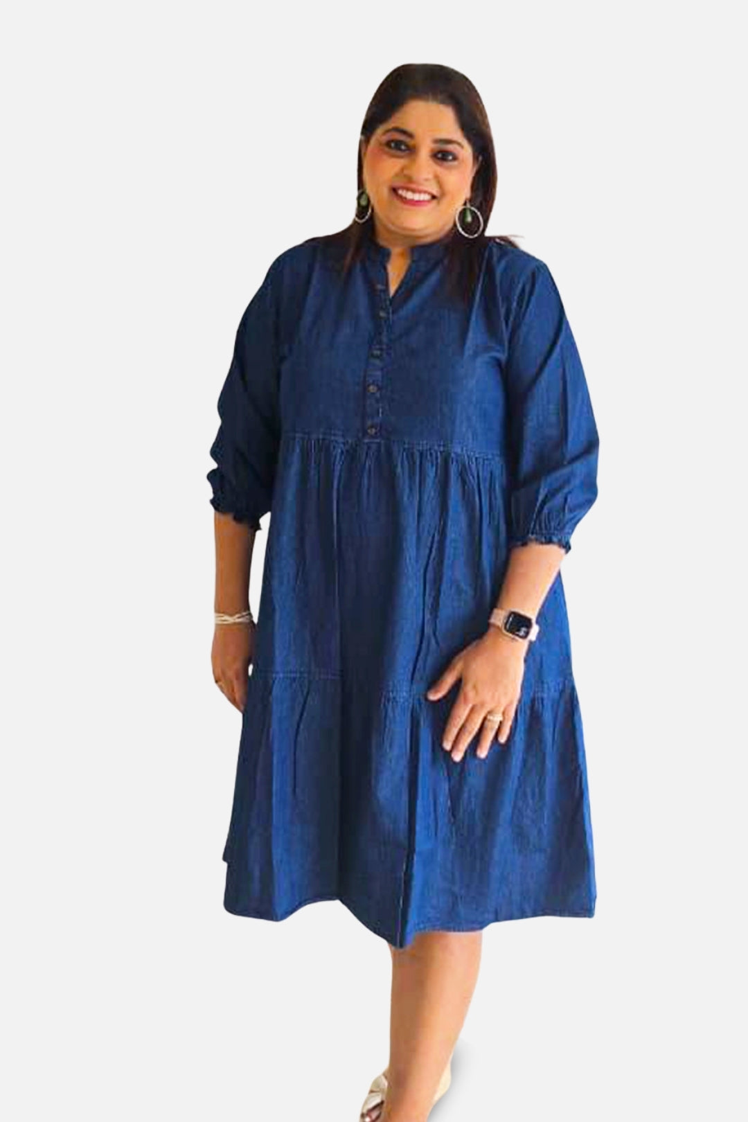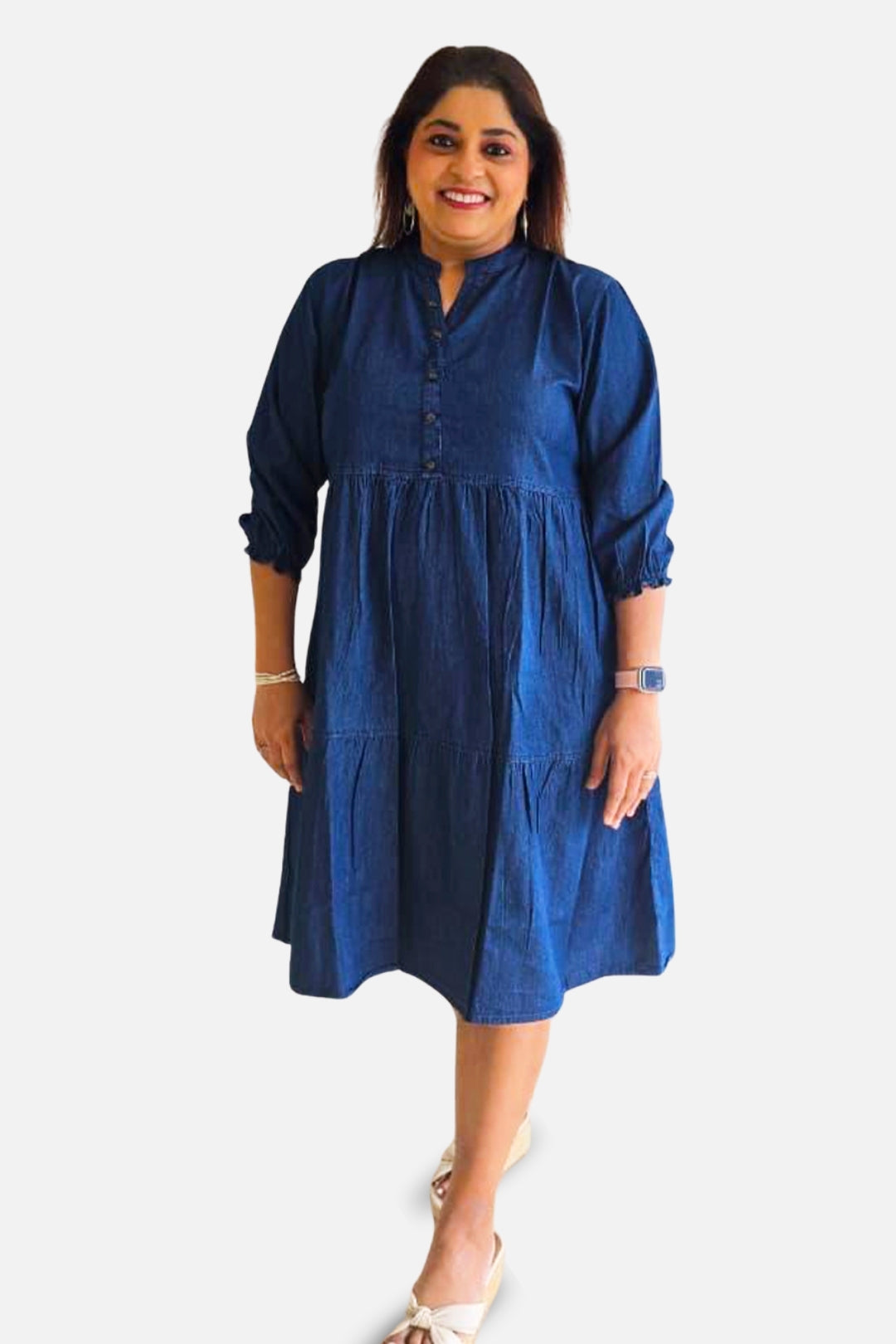 A relaxed-fit denim dress featuring soft gathers and a flattering tiered silhouette. With its elegant mandarin collar and easy 3/4th sleeves, this piece blends comfort with everyday sophistication — perfect for effortless daywear, casual outings, or relaxed weekend styling.