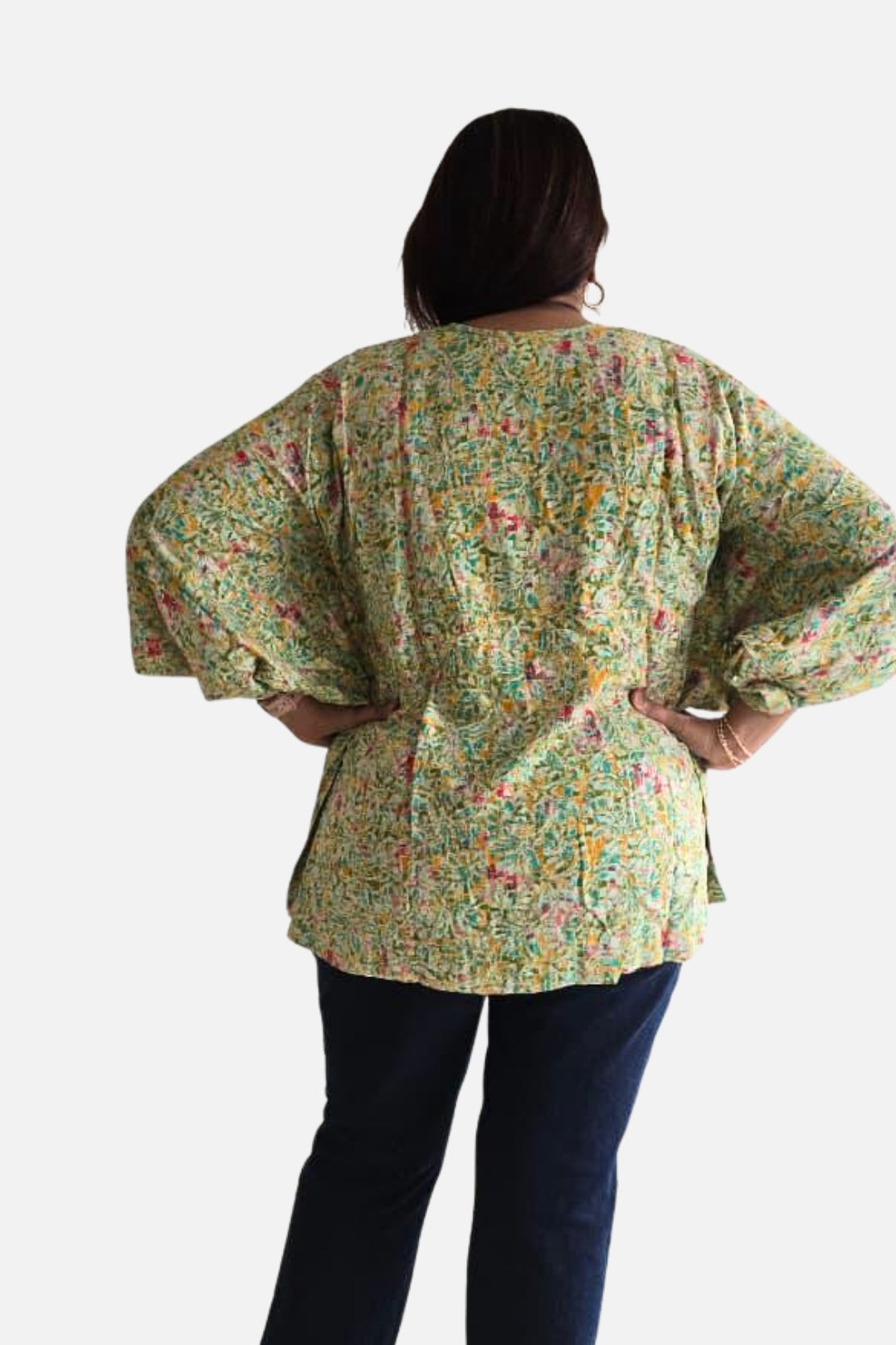 A fresh green printed top with a breezy, relaxed silhouette. Features soft gathers and easy sleeves for all-day comfort. Light, flowy, and perfect for effortless everyday styling.
