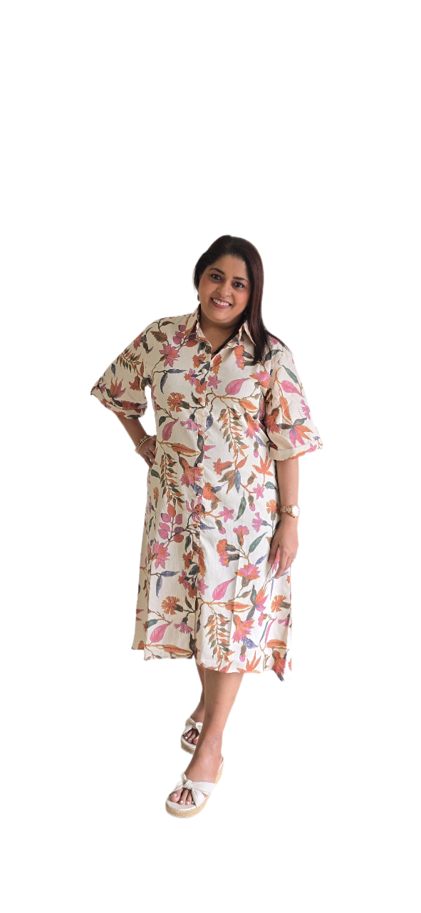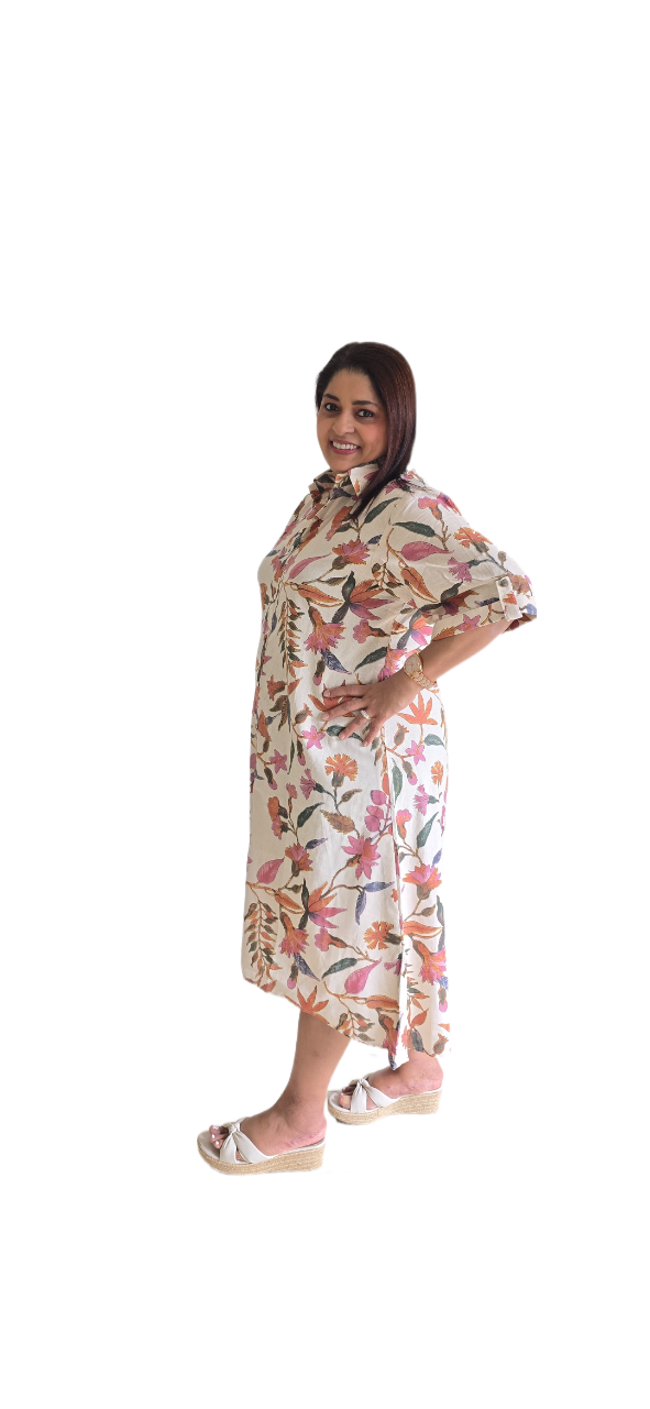 Embrace effortless elegance with our Cotton Beige Floral Shirt Dress. Crafted from soft, breathable cotton, this dress features a classic shirt silhouette elevated with delicate floral prints. The neutral beige base adds sophistication, while the floral details bring a touch of freshness and charm. Designed for comfort and versatility, it transitions seamlessly from casual daywear to an easy evening look. Style it with strappy sandals and a tote for daytime chic, or statement earrings and heels for an evening out.